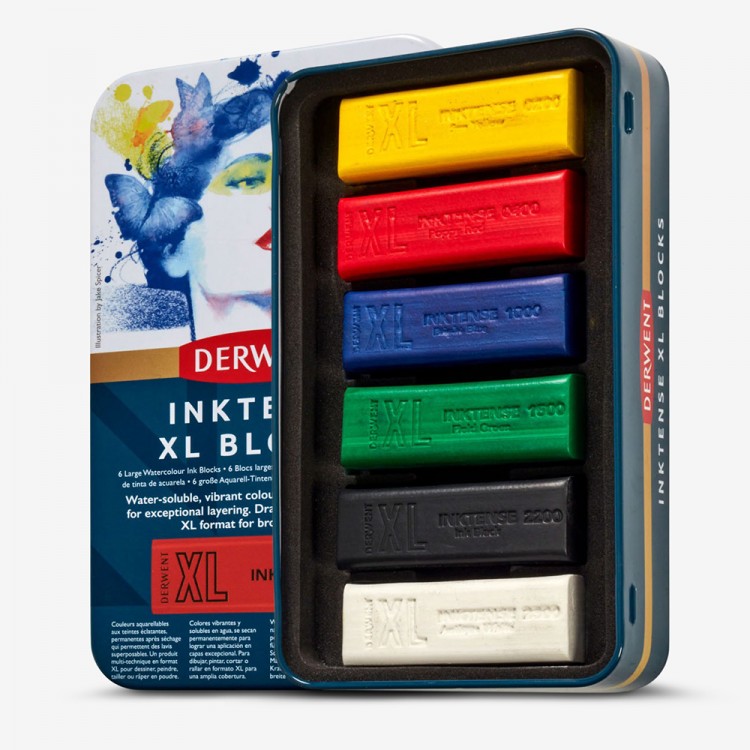 På grund av deras hållbarhet när de torkat, tvättar Inktense inte bort som akvarell så det kan arbetas över utan att påverka tidigare lager. Inktense-block kan användas på mer än bara papper - på grund av pigmentens färgningskraft kan du använda dem på många porösa ytor inklusive canvas, keramik, trä och tyg. XL-block har ett ungefärligt mått på 60 x 20 x 20 mm vardera.