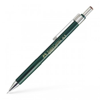 Faber-Castell stifthållare 2.0mm och 3.15mm, steglös. Mörkgrön kropp i kraftig plast med räfflat grepp och stort metallclip. Clippet kan tas loss från pennan. Stiftvässare i toppen.
