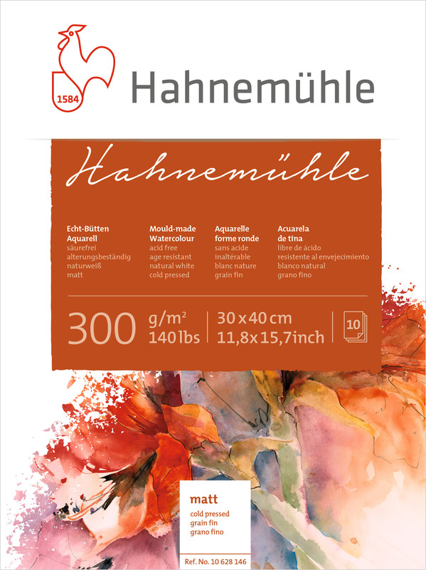 Hahnemuhle 300, detta högkvalitativa 300gsm formtillverkade akvarellpapper är syrafritt, naturvitt och har invändig limning.
