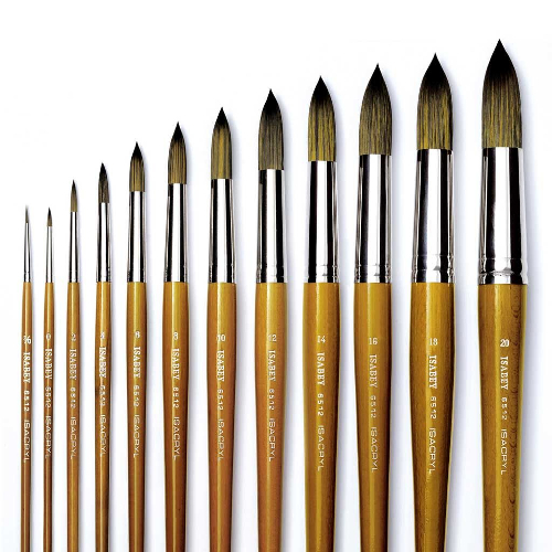 Isabey Isacryl har en speciell blandning av Taklon hår med inåt skuret och rakt hår för att skapar överlägsen kontroll. Penslarna håller färg väl, och har en fast känsla. Sömlös nickelhylsa kopplad till långa guldfärgade skaft.