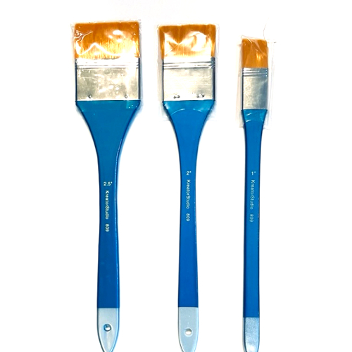 Populär prisvärd moddlare för akvarell m.m. Mjuk guldfärgad syntetfiber. Fina, täta filament. Blått lackat platt träskaft. Hylsa i nickel-mässing.