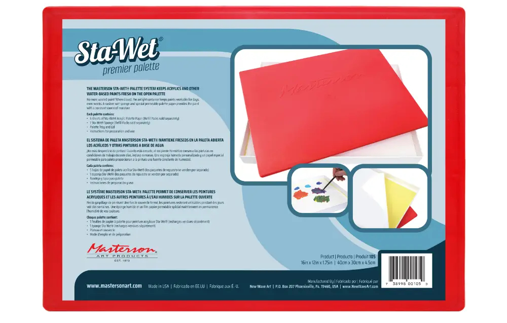 Ingen mer bortkastad färg! Sta-Wet Palette System utvecklades av Masterson för över 25 år sedan och är oöverträffad i sin funktionalitet. Mastersons Sta-Wet-system håller akryl och andra vattenbaserade färger fuktiga på den öppna paletten i timmar. När locket är stängt förblir färgerna i fungerande skick i dagar, till och med veckor. En våt svamp och speciellt permeabelt palettpapper ger färgen en konstant fuktkälla.