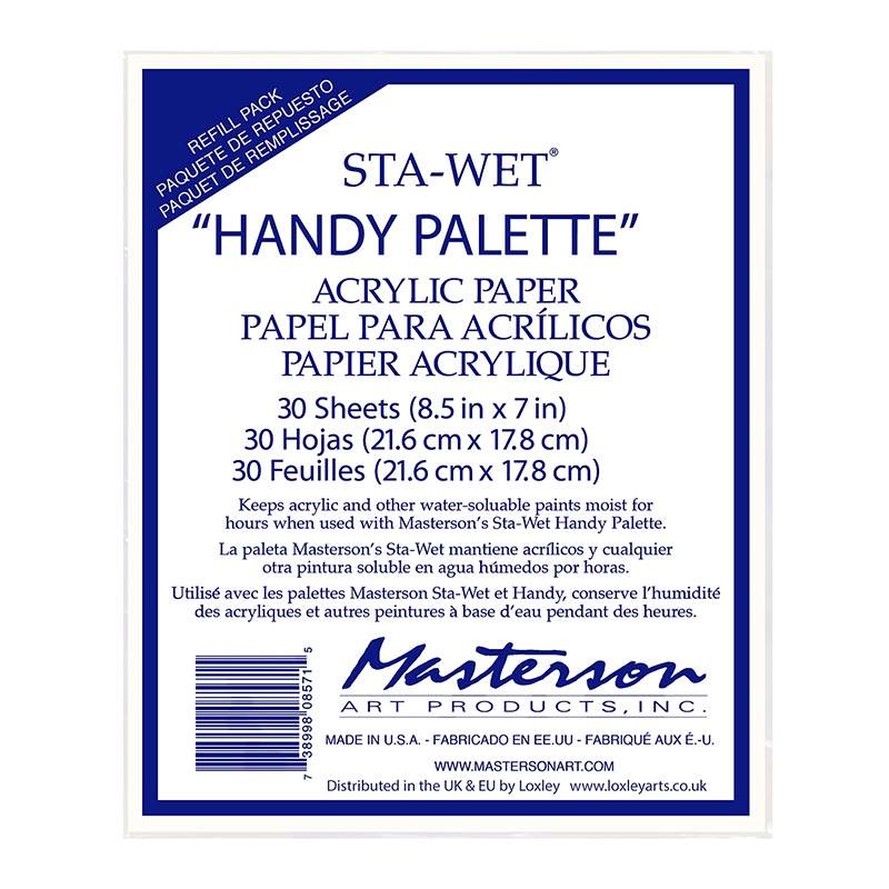 Masterson Sta-Wet akrylpalettpapper håller akrylfärger och andra vattenlösliga färger fuktiga och bearbetbara i dagar och till och med veckor genom att jämnt fördela fukten från Sta-Wet-svampen till dina färger. Pappret är permeabelt, rengöringsbart och återanvändbart.