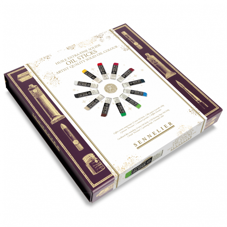Oljefärg i minikritform. Artistkvalitet. Denna eleganta magnetiska låda innehåller: Oljemålningspapper 15 ark (10 x 2.8 cm), syrafritt. 1st Precision rundpensel 8504. Målarkniv. 12st oilsticks kritor färger: